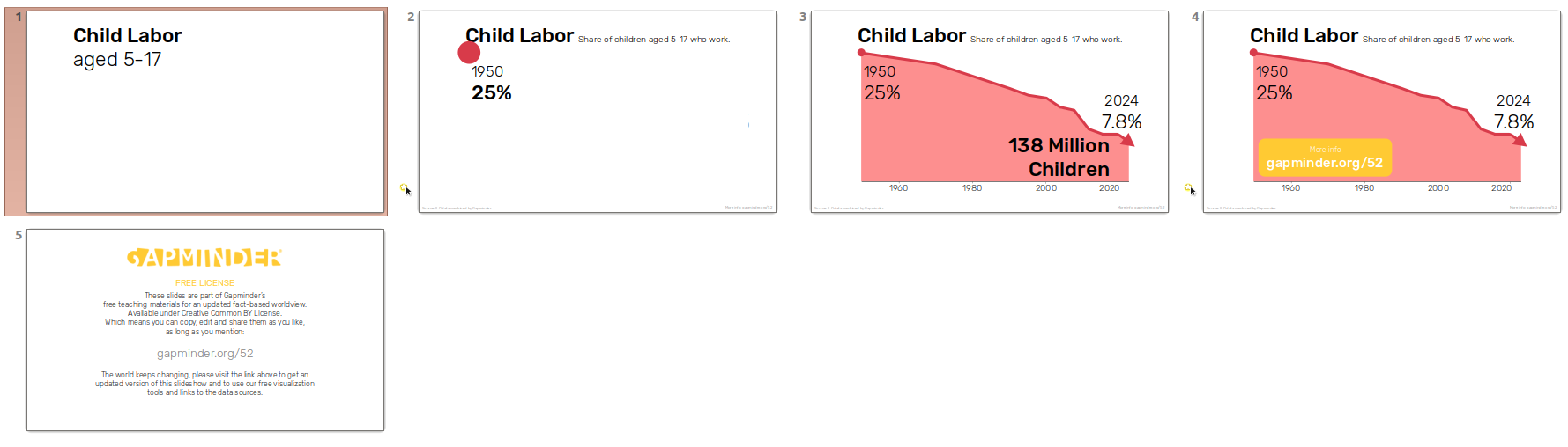 Here you can download the slideshow. The data can be found here. This teaching material is free to use and modify. Please mention gapminder.org/52